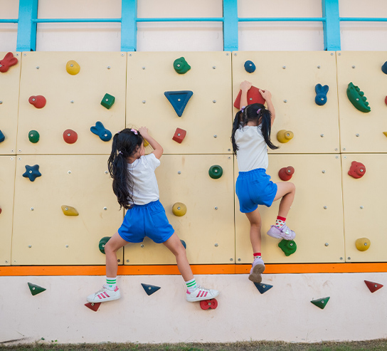 園舎の壁がボルダリングになっており、子どもたちの体力とチャレンジ精神を育みます。